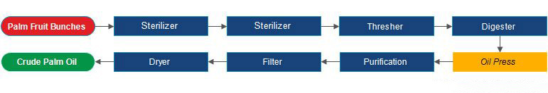 L’équipement complet de traitement de l’huile de palme comprend un stérilisateur, une batteuse, un cuiseur, une presse à huile, un réservoir d’huile brute, un filtre à huile, un équipement de raffinage d’huile, etc.